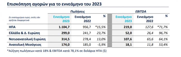 Αποτέλεσμα οι πωλήσεις το εννεάμηνο του 2023 διαμορφώθηκαν σε 1.892,2 εκ., ενώ τα κέρδη EBITDA κατά την ίδια περίοδο διαμορφώθηκαν σε 396,7 εκ.. Τα καθαρά κέρδη του Ομίλου μετά από φόρους και δικαιώματα μειοψηφίας (NPAT) υπερδιπλασιάστηκαν και διαμορφώθηκαν σε €197,6 εκ..