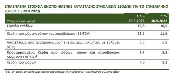 Αύξηση εσόδων κατά 31% και αύξηση λειτουργικής κερδοφορίας (Adjusted EBITDA) κατά 50% σε ενοποιημένη βάση, σε σχέση με την αντίστοιχη περίοδο 2022 κατέγραψε η Premia Properties το εννεάμηνο του 2023. Παράλληλα τα κέρδη προ φόρων, τόκων και αποσβέσεων (EBIDTA) διαμορφώθηκαν σε χαμηλότερα επίπεδα 11,3 εκατ. ευρώ σε σχέση με το εννεάμηνο του 2022 11,6 εκατ. κυρίως ως αποτέλεσμα χαμηλότερων αναπροσαρμογών επενδύσεων σε εύλογη αξία. Επιπλέον, τον Οκτώβριο η ICAP CRIF A.E., στα πλαίσια της ετήσιας αναθεώρησης, πραγματοποίησε επαναξιολόγηση της πιστοληπτικής ικανότητας της Premia και διατήρησε τη διαβάθμιση στην κλίμακα A, κατατάσσοντας την σε κατηγορία χαμηλού πιστωτικού κινδύνου.
