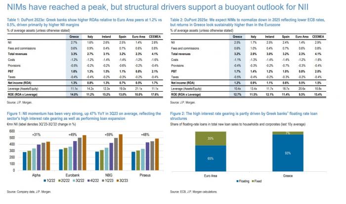 Στο πλαίσιο αυτό η JP Morgan επιβεβαιώνει την θετική της άποψη για τις προοπτικές των εγχώριων τραπεζών οι οποίες ευνοούνται από το ευνοϊκό μακροοικονομικό περιβάλλον, την εξυγίανση των ισολογισμών τους και την πιστωτική επέκταση. Όλα αυτά διαμορφώνουν μια ισχυρή βάση κερδοφορίας η οποία στηρίζεται επίσης στη μεγάλη μείωση του κόστους λειτουργίας τα τελευταία χρόνια και την υψηλή συγκέντρωση της αγοράς. Η JP Morgan επισημαίνει επίσης τις βελτιωμένες προοπτικές για τα επιστροφής κεφαλαίου μέσω μερισμάτων επιβεβαιώνοντας τις αξιολογήσεις που έχει πραγματοποιήσει για τις τέσσερις συστημικές τράπεζες.