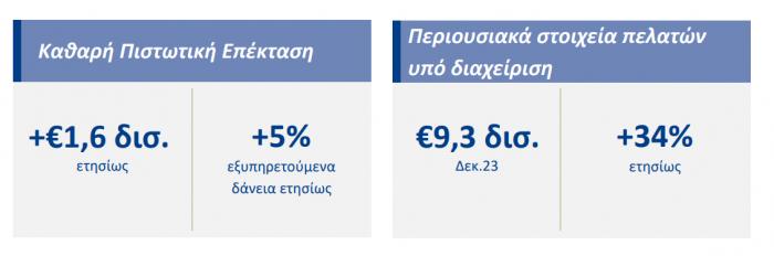 - Τα υπό διαχείριση κεφάλαια πελατών αυξήθηκαν περαιτέρω κατά 9% σε τριμηνιαία και 34% σε ετήσια βάση, στα €9,3 δισ. το 4ο τρίμηνο, λόγω σημαντικών εισροών σε προϊόντα διαχείρισης περιουσίας και της θετικής δυναμικής της αγοράς