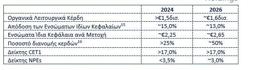 - Σε ένα περιβάλλον χαμηλότερων επιτοκίων, η Eurobank στοχεύει στη δημιουργία υψηλών αποδόσεων για τους μετόχους, οι οποίες θα ενισχυθούν περαιτέρω με την πλήρη ενσωμάτωση της Ελληνικής Τράπεζας Κύπρου, στηριζόμενη στην ισχυρή της θέση στο ελληνικό τραπεζικό σύστημα, την οργανική ανάπτυξη και την ανάληψη στρατηγικών πρωτοβουλιών στην Κύπρο και τη Βουλγαρία. Η απόδοση κεφαλαίων αναμένεται να διαμορφωθεί στο 18% το 2024 και στο 15% περίπου τα επόμενα έτη, ενώ το ποσοστό διανομής κερδών εκτιμάται ότι θα αυξηθεί σταδιακά και θα προσεγγίσει το 50% των κερδών το 2026. Η Eurobank, ως μια Τράπεζα με ισχυρή παρουσία στην ευρύτερη περιοχή και διαφοροποιημένες πηγές εσόδων, στοχεύει στην αύξηση των κερδών σε ένα περιβάλλον χαμηλότερων επιτοκίων, όπου οι εργασίες εκτός Ελλάδος θα συνεισφέρουν περίπου 50% στα Οργανικά Λειτουργικά Κέρδη του Ομίλου. Οι στόχοι της περιόδου 2024-2026 έχουν ως εξής: