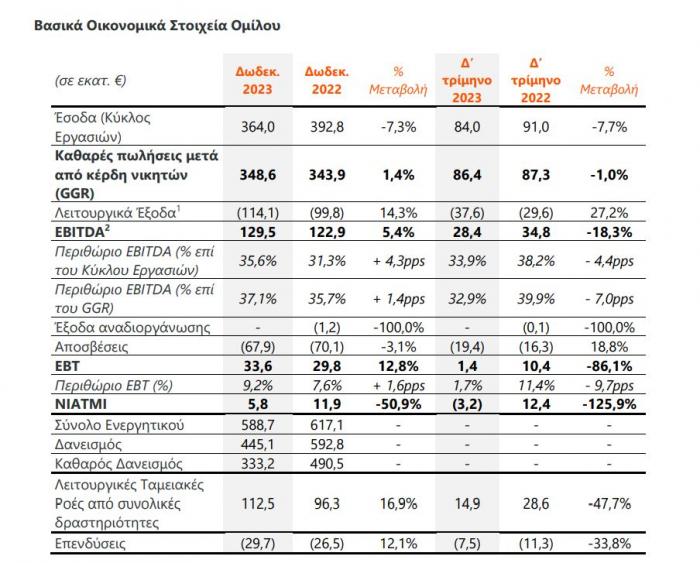 Η μείωση κατά 28,8 εκατ. ευρώ του τζίρου προήλθε από τη λήξη της άδειας στη Μάλτα που πραγματοποιήθηκε στις αρχές Ιουλίου του 2022 και στα χαμηλότερα έσοδα στην Αργεντινή, έπειτα από τις πρόσφατες οικονομικές μεταρρυθμίσεις στην χώρα και την απόφαση της νέας κυβέρνησης να προβεί σε υποτίμηση του πέσο πάνω από 50% τον τελευταίο μήνα του έτους. Σε τοπικό νόμισμα, τα αποτελέσματα της τρέχουσας περιόδου παρουσίασαν αύξηση 194,8% σε ετήσια βάση.