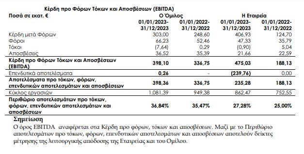 - Τα καθαρά κέρδη του Ομίλου ανήλθαν σε 303,00 εκατ. καταγράφοντας αύξηση +21,88% συγκρινόμενα με τα 248,60 εκατ. του 2022.
