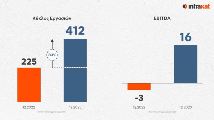 Θεαματική αύξηση του κύκλου εργασιών, κατά 83%, πέτυχε το 2023 ο όμιλος της Intrakat, ενσωματώνοντας μάλιστα μόνο για δύο μήνες στα οικονομικά του αποτελέσματα την Άκτωρ. Η Intrakat επέστρεψε σε κερδοφορία, με EBITDA 16 εκατ. ευρώ και καθαρά κέρδη 3 εκατ. ευρώ, ενώ διατηρεί ρευστά διαθέσιμα αυξημένα κατά 100 εκατ. ευρώ.