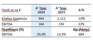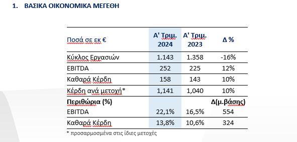 - 12% αύξηση των Κερδών προ Φόρων, Τόκων και Αποσβέσεων (EBITDA) που ανήλθαν σε 252 εκατ., έναντι 225 εκατ. το A’ τρίμηνο του 2023.