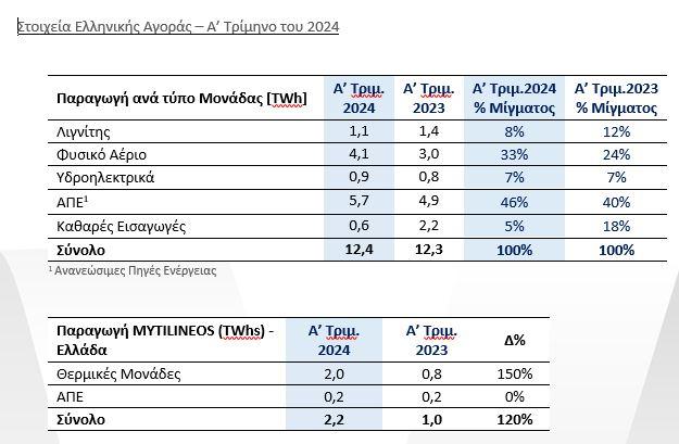 Η συνολική παραγωγή της MYTILINEOS, εντός Ελλάδος, τόσο από τις θερμικές, όσο και από τις ανανεώσιμες μονάδες της Εταιρείας ανήλθε σε 2,2 TWh, ποσότητα που αντιστοιχεί στο 18% της συνολικής ζήτησης. Αναφορικά με την παραγωγή ηλεκτρικής ενέργειας από θερμικές μονάδες, οι τρείς σταθμοί συνδυασμένου κύκλου (CCGTs) και ο ένας σταθμός συμπαραγωγής ηλεκτρισμού-θερμότητας υψηλής αποδοτικότητας (CHP), παρήγαγαν αθροιστικά ~2 TWh. Η ποσότητα αυτή αντιπροσωπεύει περίπου 17% της συνολικής ζήτησης στο διασυνδεδεμένο σύστημα και το 49% της παραγωγής από μονάδες φυσικού αερίου, από 27% που ήταν στο αντίστοιχο διάστημα του προηγούμενου έτους.