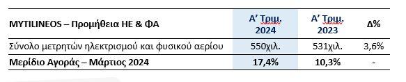 Ως εκ τούτου, στο τέλος του Α’ τριμήνου του 2024, η MYTILINEOS εκπροσωπεί πλέον 550 χιλιάδες μετρητές ηλεκτρισμού και φυσικού αέριου, ενώ το μερίδιό της στην αγορά ηλεκτρισμού τον Μάρτιο του 2024 ξεπέρασε το 17% (μερίδια ΕΧΕ). Το επόμενο διάστημα, η MYTILINEOS στοχεύει να ξεπεράσει το 25% της ελληνικής κατανάλωσης, συνυπολογίζοντας και την εκπροσώπηση του Αλουμινίου της Ελλάδος, δημιουργώντας ένα ολοκληρωμένο «πράσινο» utility με διεθνή παρουσία. Έχοντας αξιοποιήσει την καθετοποίηση της λειτουργίας της Εταιρείας στον Κλάδο Ενέργειας, η MYTILINEOS εδραιώνεται πλέον ως ένας ολοκληρωμένος πάροχος ενέργειας της νέας εποχής.
