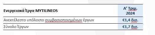 Στο τέλος του Α’ τριμήνου του 2024, το ανεκτέλεστο υπόλοιπο των συμβασιοποιημένων έργων ανήλθε στα €1,4 δισ., ενώ συμπεριλαμβανομένων των έργων που βρίσκονται σε προχωρημένο στάδιο συμβασιοποίησης, το σύνολο ανέρχεται στα €1,7 δισ., εκ των οποίων το 10% αφορά σε έργα στην Ελλάδα, το 24% στην Πολωνία και το 45% στο Ηνωμένο Βασίλειο, δραστηριότητα η οποία αναμένεται να σημειώσει σημαντικούς ρυθμούς ανάπτυξης.