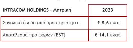 Στα 18,3 εκατ. ευρώ διαμορφώθηκαν για το 2023 τα καθαρά κέρδη του ομίλου Intracom από το σύνολο των δραστηριοτήτων του, όπου στη νέα του μορφή σημείωσε:
