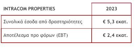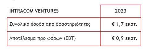 Η INTRACOM VENTURES, 100% θυγατρική της INTRACOM HOLDINGS που ιδρύθηκε τον Νοέμβριο του 2022 και στοχεύει στη δημιουργία υπεραξίας μέσω χαρτοφυλακίου στοχευμένων επενδύσεων, με σκοπό την ανάπτυξη ενός ευρέως φάσματος χαρτοφυλακίου και στόχο υψηλής υπεραξίας επενδύσεις, κατέγραψε συνολικό έσοδο από τις δραστηριότητές της € 1,7 εκατ. και κέρδη προ φόρων € 0,9 εκατ.