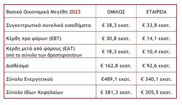 Το Διοικητικό Συμβούλιο της Εταιρείας, θα εισηγηθεί στην Τακτική Γενική Συνέλευση, την απόδοση 0,12 ευρώ ανά μετοχή, για 3η συνεχή χρονιά, στο πλαίσιο σταθερής ανταποδοτικότητας προς τους μετόχους. Τα βασικά οικονομικά μεγέθη του έτους 2023, σύμφωνα με τα διεθνή λογιστικά πρότυπα διαμορφώνονται ως εξής: