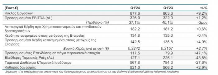 - Δυναμικό ξεκίνημα το 2024: Σημαντική αύξηση κατά 9,2% στα έσοδα του Ομίλου & κατά 1,2% στο προσαρμοσμένο EBITDA (AL)