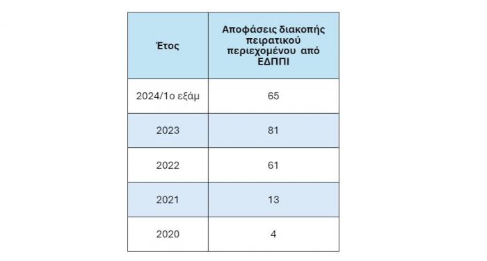 Είναι χαρακτηριστικό πως, εκτός από τις δεκάδες επιχειρήσεις που πραγματοποίησε η Αστυνομία, σύμφωνα και με τα στοιχεία της Επιτροπής για τη Γνωστοποίηση Διαδικτυακής Προσβολής Δικαιωμάτων Πνευματικής Ιδιοκτησίας και Συγγενικών Δικαιωμάτων (ΕΔΠΠΙ), στην περίοδο των Play Off και Final Four της Εuroleague, από τις 23/04/2024 έως και τις 26/05/2024, λήφθηκαν 35 αποφάσεις και διακόπηκε από τους αρμόδιους παρόχους (ISPs) η πρόσβαση σε τουλάχιστον 250 πειρατικές διευθύνσεις διαδικτυακού πρωτοκόλλου (IP Addresses).