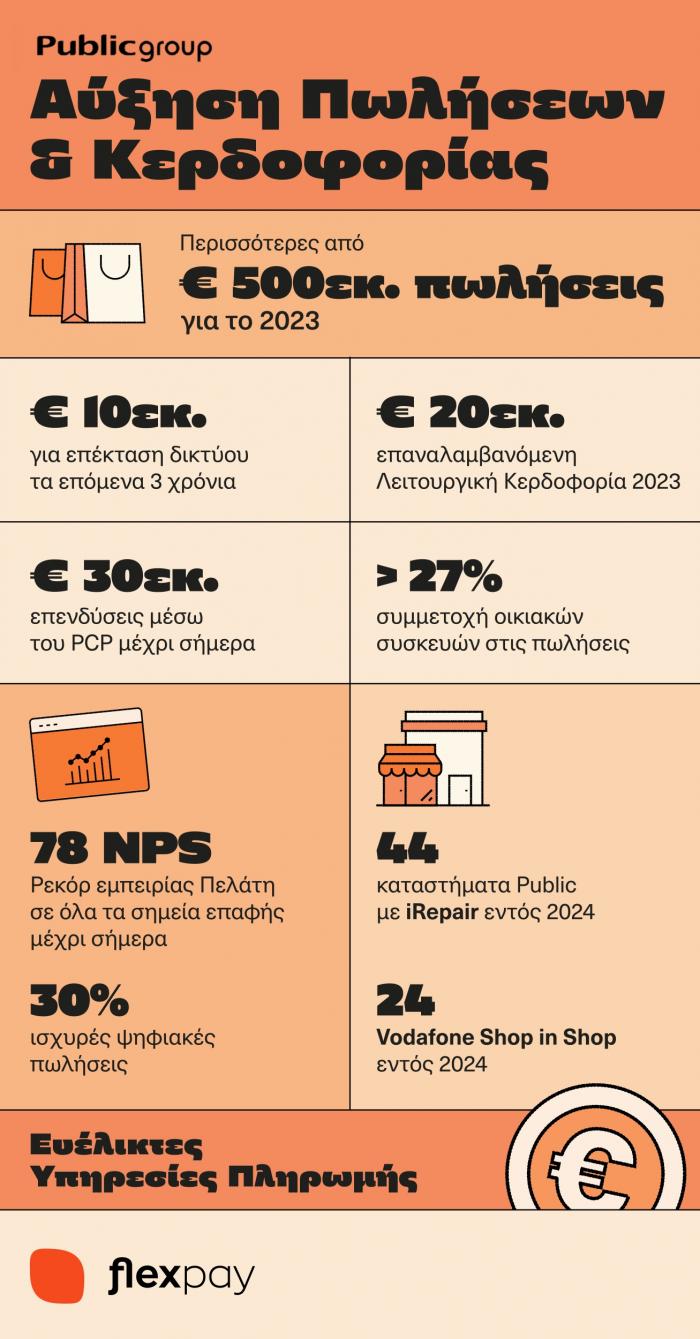 Σχετικά με τις επιδόσεις του 2023, ο Ρόμπυ Μπουρλάς, Διευθύνων Σύμβουλος του Public Group, ανέφερε: «Παρά τις προκλήσεις της οικονομίας από την ενεργειακή κρίση και τις πληθωριστικές πιέσεις, παραμένουμε προσηλωμένοι σε ένα πλάνο που έρχεται να απαντήσει τόσο στις σύγχρονες ανάγκες καταναλωτών, όσο και στο σημαντικό περιορισμό του διαθέσιμου εισοδήματος τους, δημιουργώντας νέους ευέλικτους τρόπους πληρωμής για αυτούς που έχουν πραγματική ανάγκη. Παράλληλα, συνεχίζουμε να πρωτοπορούμε στο Omni-Retail, καθώς δημιουργούμε συνεχώς καινοτόμες ψηφιακές εμπειρίες για τους ανθρώπους, τους πελάτες και τους συνεργάτες μας».
