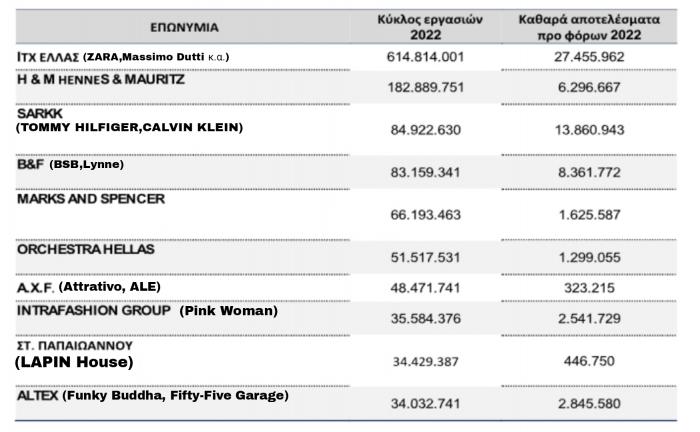 Σύμφωνα με τους ισολογισμούς του 2022 - ακόμη δεν έχουν δημοσιεύσει μεγέθη για το 2023 όλες οι εταιρείες- η ITX EΛΛΑΣ (Zara, Massimo Dutti κ.α) κυριαρχεί με τζίρο 614 εκατ. ευρώ και κέρδη προ φόρων 27,5 εκατ. ευρώ. Ακολουθεί η H&M με τζίρο 183 εκατ. ευρώ και κέρδη προ φόρων 6,3 εκατ. ευρώ, ενώ στην τρίτη θέση βρίσκεται η Sarkk (Tommy Hilfiger και Calvin Klein) με πωλήσεις 85 εκατ. ευρώ και κέρδη προ φόρων 13,8 εκατ. ευρώ.