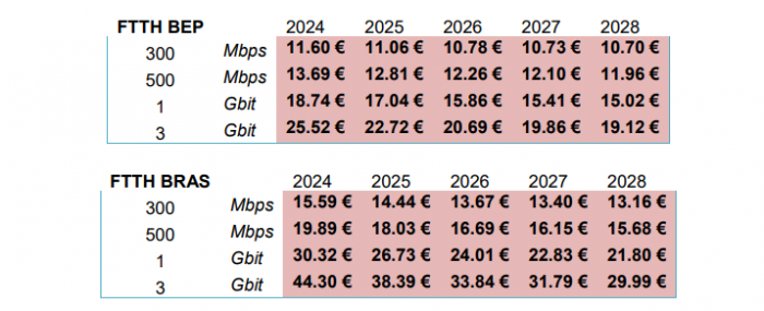 Σχετικά με τις χρεώσεις, η πρόταση του ΟΤΕ προβλέπει ελαφρώς υψηλότερες χρεώσεις από τις ισχύουσες, κατά 11 έως 40 λεπτά, που μπορούν να απορροφηθούν από τους παρόχους. Προβλέπει, επίσης, μειώσεις τα επόμενα χρόνια έως και το 2028, που φθάνουν σωρευτικά από 8% περίπου για τις συνδέσεις των 300Mbps έως το 25% για τις συνδέσεις των 3Gbps. Σημειώνεται, εξάλλου, ότι τον Σεπτέμβριο έρχεται το νέο κουπόνι Gigabit Voucher που θα επιδοτήσει τις συνδέσεις υπερυψηλών ταχυτήτων για τα επόμενα δύο χρόνια.