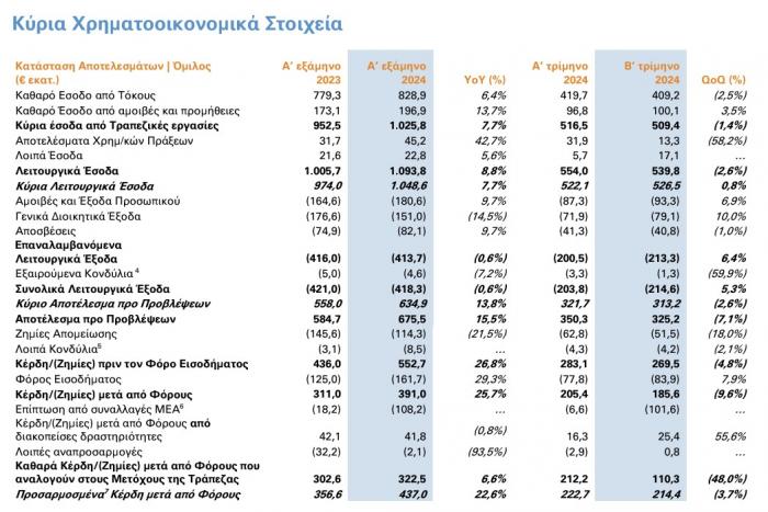 - Τα Καθαρά κέρδη μετά από φόρους ανήλθαν σε 322,5 εκατ. το α’ εξάμηνο 2024, ενισχυμένα κατά 6,6% σε σχέση με το αντίστοιχο εξάμηνο του 2023, ως αποτέλεσμα των υψηλότερων εσόδων καθώς και της βελτίωσης του κόστους και των προβλέψεων, τα οποία απορρόφησαν πλήρως την επίπτωση από την επιτάχυνση της εξυγίανσης του χαρτοφυλακίου ΜΕΑ.