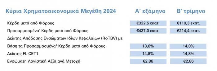 - Το α’ εξάμηνο 2024, ο Δείκτης Απόδοσης Ενσώματων Ιδίων Κεφαλαίων με βάση τα Προσαρμοσμένα Κέρδη μετά από Φόρους διαμορφώθηκε σε 13,6%, τα Προσαρμοσμένα Κέρδη ανά μετοχή ανήλθαν σε 0,18 ευρώ, ενώ ο Δείκτης FL CET1 σημείωσε αύξηση 50 μ.β. σε τριμηνιαία βάση λαμβανομένης υπόψη της πρόβλεψης για διανομή μερίσματος.