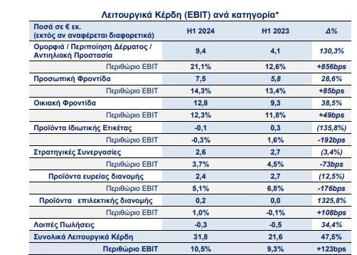 Το ΕΒΙΤ στα προϊόντα Προσωπικής Φροντίδας διαμορφώθηκε σε €7,5εκ. από €5,8εκ., αυξημένο κατά 28,6%, καθώς επηρεάστηκε θετικά από τη βελτίωση του κόστους με συνέπεια τη βελτιστοποίηση του περιθωρίου μικτού κέρδους, καθώς και από την ισορροπημένη διαχείριση εξόδων διαφήμισης και προώθησης. Το περιθώριο ΕΒΙΤ των προϊόντων Προσωπικής Φροντίδας διαμορφώθηκε σε 14,3% το Α’ εξάμηνο 2024 από 13,4% το Α’ εξάμηνο 2023.