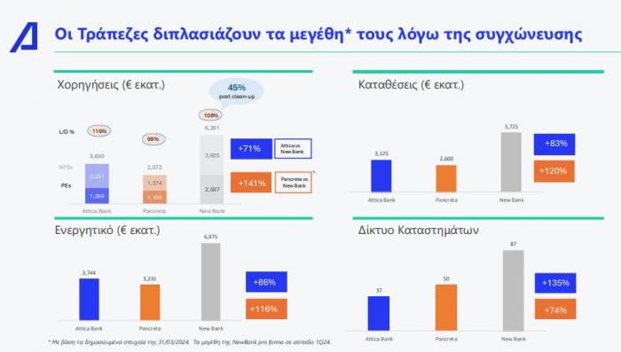 Η συγχώνευση αυτή θα μας επιτρέψει, ουσιαστικά διπλασιάζοντας τα μεγέθη μας και να επιτύχουμε οικονομίες κλίμακας, μειώνοντας το λειτουργικό μας κόστος και ενισχύοντας την αποδοτικότητα της διοικητικής μας οργάνωσης. Με βάση τα στοιχεία του πρώτου τριμήνου, το ενεργητικό, οι καταθέσεις και οι χορηγήσεις μας ανέρχονται σε περίπου 7 δισ. ευρώ, 5,8 δισ. και 6,2 δισ. ευρώ αντίστοιχα, ενώ τα εξυπηρετούμενα δάνεια διαμορφώνοντα στα 3 δισ. Τα μεγέθη αυτά πιστοποιούν την εγκαθίδρυση της 5ης μεγαλύτερης τράπεζας στη χώρα. Αυτό σημαίνει ότι θα μπορέσουμε να προσφέρουμε καλύτερες υπηρεσίες στους πελάτες μας, διατηρώντας παράλληλα την ανταγωνιστικότητά μας στην αγορά.