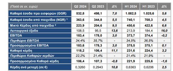 Το μικτό κέρδος από παιχνίδια το α’ εξάμηνο 2024 διαμορφώθηκε στα €450,6εκ. έναντι €422,6εκ. το α’ εξάμηνο 2023, αυξημένο κατά 6,6% σε ετήσια βάση. Το μικτό κέρδος από παιχνίδια το β’ τρίμηνο 2024 ανήλθε στα €223,9εκ. έναντι €204,6εκ. το β’ τρίμηνο 2023, αυξημένο κατά 9,5% σε ετήσια βάση, συμβαδίζοντας με την αύξηση των εσόδων.