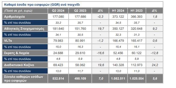 Τα καθαρά έσοδα προ εισφορών (GGR) το α’ εξάμηνο 2024 διαμορφώθηκαν στα €1.082,5εκ., αυξημένα κατά 5,6% σε σχέση με την αντίστοιχη περίοδο πέρυσι (α’ εξάμηνο 2023: €1.025,6εκ.). Το β’ τρίμηνο 2024 τα GGR διαμορφώθηκαν στα €532,8εκ., αυξημένα κατά 7,0% σε ετήσια βάση, ενισχυμένα κυρίως από τις ισχυρές επιδόσεις στο online σε συνδυασμό με τη θετική συνεισφορά του retail, υποβοηθούμενα επίσης από την ισχυρή επίδοση κατά τη διάρκεια του Euro'24.