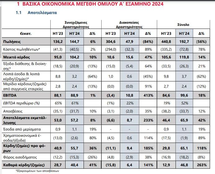 Στα συγκριτικά μεγέθη του Ομίλου (Α’ εξάμηνο 2023), στις διακοπείσες δραστηριότητες, εκτός από τον κλάδο Κατασκευής προστέθηκε και ο κλάδος Περιβάλλοντος για λόγους συγκρισιμότητας και ορθότερης απεικόνισης των αποτελεσμάτων.