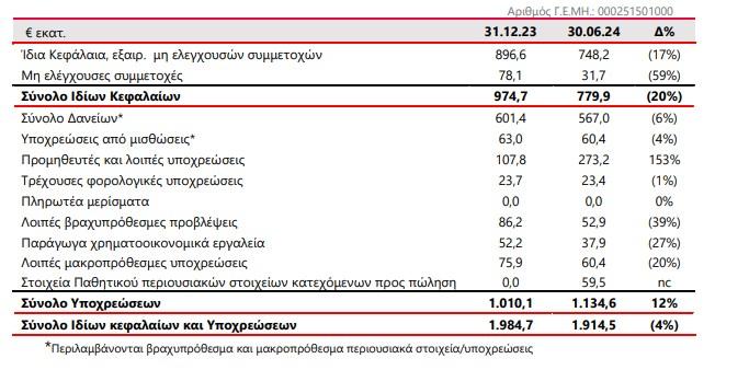 - Σύνολο Ιδίων Κεφαλαίων €780 εκατ. ήτοι €2,24 ανά μετοχή. Ίδια κεφάλαια αναλογούντα στους μετόχους της πλειοψηφίας €748 εκατ., ήτοι €2,15 ανά μετοχή. Τα ίδια κεφάλαια επηρεάστηκαν από την επιστροφή κεφαλαίου στους μετόχους (απόφαση ΤΓΣ 31.05.2024) συνολικού ποσού €174,1 εκατ. (€0,50/μτχ).