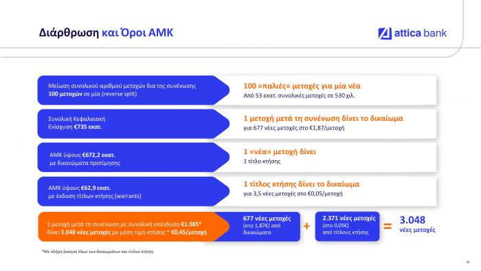 Σύμφωνα με την κα Βρεττού «αυτό σημαίνει ότι όλοι οι υφιστάμενοι μέτοχοι της τράπεζας θα έχουν την ευκαιρία να συμμετάσχουν ενεργά στην νέα ΑΜΚ ενώ το σύνολο της κεφαλαιακής ενίσχυσης ανέρχεται στα 735 εκατ. ευρώ. Προηγουμένως θα υπάρξει μείωση του συνολικού αριθμού μετοχών της τράπεζας μέσω reverse split των παλαιών μετοχών: 100 «παλιές» μετοχές θα συνενωθούν σε 1 νέα μετοχή, ώστε το reverse split να μειώσει τον συνολικό αριθμό των μετοχών από 53 εκατομμύρια σε 530 χιλιάδες. Μετά τη συνένωση, κάθε νέα μετοχή θα δίνει το δικαίωμα στον μέτοχο να αποκτήσει 677 νέες μετοχές στην τιμή των €1,87 ανά μετοχή. Επιπλέον, τα warrants θα δίνουν το δικαίωμα στον κάτοχο να αποκτήσει 2.371 νέες μετοχές στην τιμή των €0,05 έκαστη. Έτσι, συνολικά, κάθε μέτοχος θα έχει το δικαίωμα να αποκτήσει 3.048 νέες μετοχές με μια μέση τιμή κτήσης περίπου €0,45 ανά μετοχή, εφόσον ασκηθούν όλα τα δικαιώματα και οι τίτλοι κτήσης. Αυτή η διάρθρωση εξασφαλίζει τη συμμετοχή των υφιστάμενων μετόχων στη διαδικασία της αύξησης του κεφαλαίου, ενώ παράλληλα ενισχύει την κεφαλαιακή επάρκεια της τράπεζας».