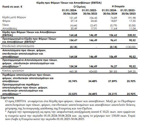 Τα κέρδη προ Φόρων, Τόκων και Αποσβέσεων (EBITDA) του Ομίλου ανήλθαν σε 164,68 εκατ. (από 146,49 εκατ. την προηγούμενη αντίστοιχη περίοδο), παρουσιάζοντας αύξηση κατά +12,42%.