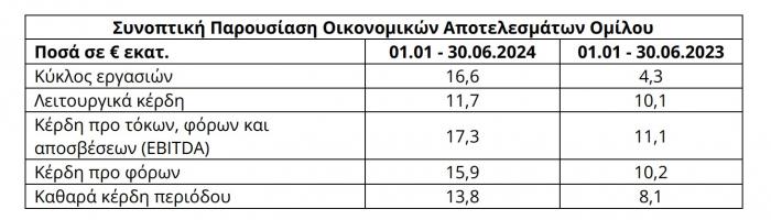 Ο κύκλος εργασιών διαμορφώθηκε στα 16,6 εκατ. ευρώ έναντι 4,3 εκατ. το ίδιο διάστημα πέρυσι. Τα κέρδη προ φόρων έφθασαν τα 15,9 εκατ. ευρώ έναντι 10,2 εκατ. το α’ εξάμηνο του 2023.