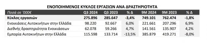 Ο Κύκλος Εργασιών αλλά και η λειτουργική κερδοφορία στηρίχθηκαν από την για άλλη μια χρονιά ιδιαίτερα θετική διαχείριση της ζήτησης για βραχυχρόνιες, κυρίως τουριστικές, μισθώσεις αλλά και από τη σημαντική αύξηση του στόλου των μακροχρόνιων ενοικιάσεων κατά τους τελευταίους 12 μήνες. Αντίθετα η δραστηριότητα της εμπορίας αυτοκίνητων είχε μικρή υποχώρηση σε σχέση με το 2023 διατηρώντας όμως σημαντική κερδοφορία.