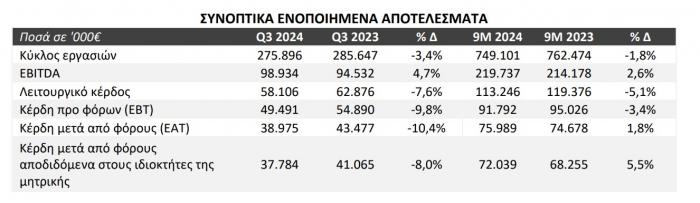 Σε επίπεδο εννεάμηνου, ο ενοποιημένος Κύκλος Εργασιών ανήλθε σε 749,1 εκατ. έναντι 762,5 εκατ. την αντίστοιχη περσινή περίοδο. Αντίστοιχα, το ΕΒΙTDA ανήλθε στα 219,7 εκατ., αυξημένο κατά 2,6%, ενώ τα ενοποιημένα Κέρδη μετά από Φόρους διαμορφώθηκαν σε 76 εκατ., οριακά αυξημένα κατά 1,8%.
