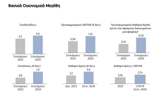 Ισχυρή λειτουργική κερδοφορία για το εννεάμηνο 2024 με τα προσαρμοσμένα κέρδη προ τόκων, φόρων και αποσβέσεων (EBITDA) να διαμορφώνονται σε €1.348 εκατ. Στο θετικό αυτό αποτέλεσμα, συνέβαλε η αυξημένη συνεισφορά των δραστηριοτήτων της Διανομής, η βελτίωση της κερδοφορίας των δραστηριοτήτων της παραγωγής και εμπορίας ηλεκτρικής ενέργειας και η προσθήκη των δραστηριοτήτων στη Ρουμανία αλλά και της Κωτσόβολος στην Ελλάδα.