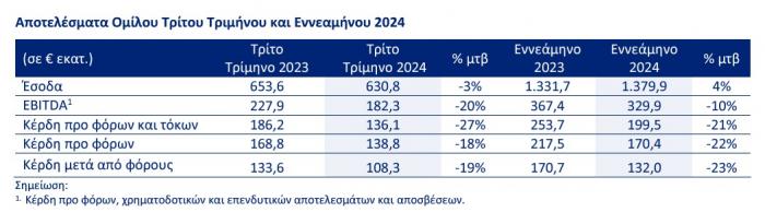 Τα Κέρδη ΕΒΙΤDA διαμορφώθηκαν σε 330 εκατ., τα Κέρδη προ Φόρων ανήλθαν στα 170,4 εκατ. ενώ τα Κέρδη μετά από Φόρους του εννεαμήνου ανήλθαν στα 132,0 εκατ., 23% χαμηλότερα από την αντίστοιχη περίοδο του 2023.
