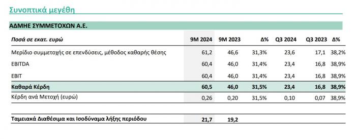 Ανοδική πορεία ακολούθησαν τα μεγέθη του ΑΔΜΗΕ τόσο στο 9μηνο όσο και στο γ' τρίμηνο του 2024, σε ετήσια βάση, με την αύξησή τους να ξεπερνά το 31% για το 9μηνο και το 38% για το γ' τρίμηνο.