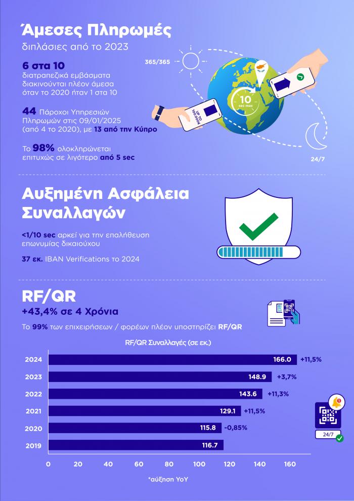 - Συναλλαγές ΔΙΑΣ: Έφτασαν τα 467,2 εκατομμύρια, σημειώνοντας αύξηση 15% σε σχέση με το 2023 και 60% σε σχέση με το 2020, με συνολική αξία €501,9 δισ. (+11,6% ετήσια αύξηση).