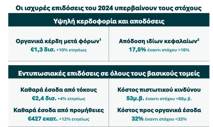 Πράγματι, υπερβήκαμε τους στόχους που είχαμε θέσει για το 2024 – οι οποίοι αναθεωρήθηκαν προς τα πάνω τον Αύγουστο – σε όλα τα επίπεδα. Είναι ενδεικτικό ότι, τα οργανικά κέρδη μετά φόρων ανήλθαν σε €1,3 δισ., με την απόδοση ενσώματων ιδίων κεφαλαίων να διαμορφώνεται σε 17,5%, υπερβαίνοντας κατά πολύ τον στόχο ύψους >16%.