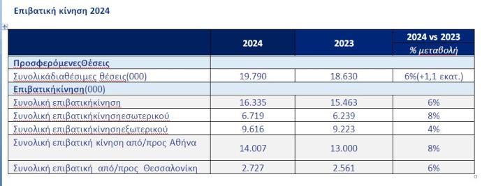 Συνολικά το 2024 η AEGEAN μετέφερε 16,3 εκατ. επιβάτες, καταγράφοντας για το 2024 ετήσια αύξηση 6% σε σχέση με το 2023, έχοντας προσφέρει περισσότερες από 19,7 εκατ. θέσεις, αυξημένες κατά 1,1 εκατ. παρά τις επιχειρησιακές και γεωπολιτικές προκλήσεις και κατέγραψε ένα ακόμη, νέο ιστορικό υψηλό στην επιβατική κίνηση της εταιρείας.