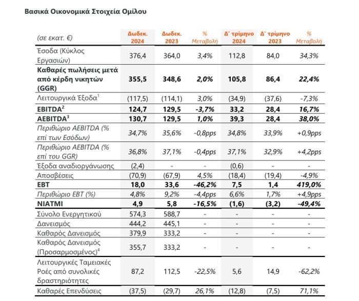 - Κατά το δωδεκάμηνο του 2024, τα έσοδα του Ομίλου διαμορφώθηκαν στα 376,4 εκατ. (+3,4% σε ετήσια βάση).