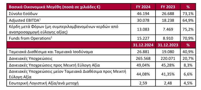 Τα Καθαρά Κέρδη, μη συμπεριλαμβανομένων των κερδών από την αναπροσαρμογή της εύλογης αξίας των επενδύσεων σε ακίνητα ανήλθαν σε 13,1 εκατ. ευρώ έναντι 7,5 εκατ. ευρώ (αυξημένα κατά 75,2%) σε σύγκριση με το 2023.