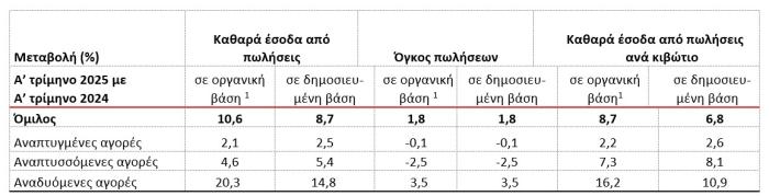 - Αύξηση των καθαρών εσόδων από πωλήσεις κατά 8,7% σε δημοσιευμένη βάση, με την ισχυρή αύξηση σε οργανική βάση να αντισταθμίζεται εν μέρει από τον αντίκτυπο των δυσμενών συναλλαγματικών διαφορών μετατροπής των αποτελεσμάτων στο νόμισμα αναφοράς του Ομίλου στις αναδυόμενες αγορές.