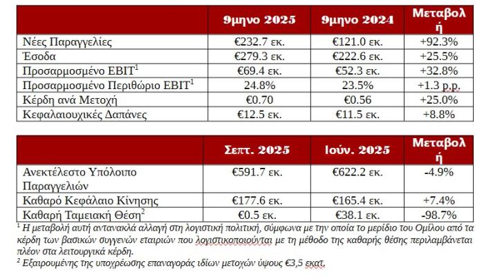 - Η ισχυρή εισροή νέων παραγγελιών συνεχίστηκε, με τις νέες παραγγελίες να ανέρχονται σε 232,7 εκατ. κατά το 9μηνο του 2025, σημειώνοντας αύξηση 92% σε σύγκριση με το αντίστοιχο διάστημα του 2024. Επιπλέον, προστέθηκαν πρόσθετα δικαιώματα αγοράς ύψους 150 εκατ., τα οποία παρουσιάζουν υψηλή πιθανότητα μετατροπής σε ανεκτέλεστο υπόλοιπο παραγγελιών τα επόμενα έτη.