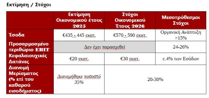Σήμερα, η THEON αυξάνει την εκτίμηση εσόδων για το Οικονομικό Έτος 2025 στα 435 - 445 εκατ., υψηλότερα από το αρχικό εύρος εκτίμησης των 410 - 430 εκατ. Επιπλέον, για πρώτη φορά, η THEON παρουσιάζει στόχο εσόδων για το Οικονομικό Έτος 2026, με τα έσοδα να κυμαίνονται μεταξύ 570 - 590 εκατ. Η εταιρία στοχεύει σε τουλάχιστον 20% οργανική ανάπτυξη, με συνολική ανάπτυξη περίπου 30% λαμβάνοντας υπόψιν την εξαγορά της εταιρίας Kappa Optronics, όπως έχει ήδη ανακοινωθεί.