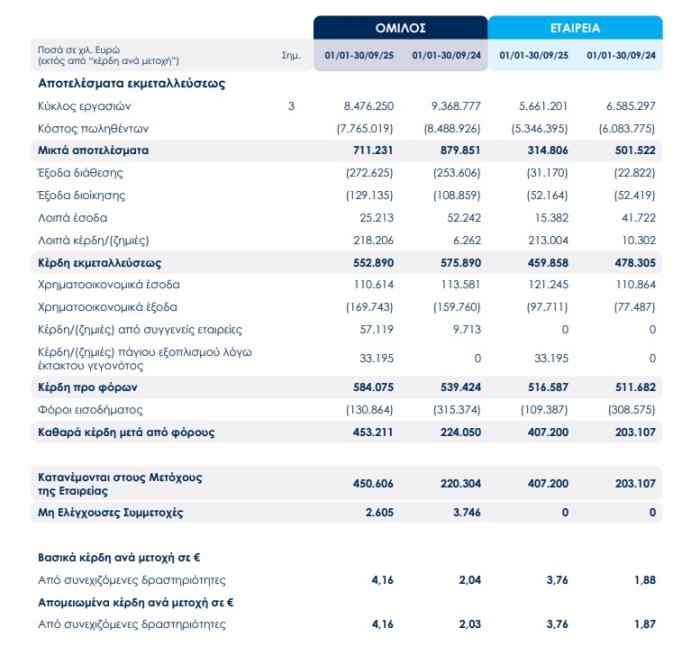 Τα κέρδη προ φόρων ανήλθαν στα 584 εκατ. ευρώ από 539 εκατ. ευρώ το αντίστοιχο περυσινό εννεάμηνο.