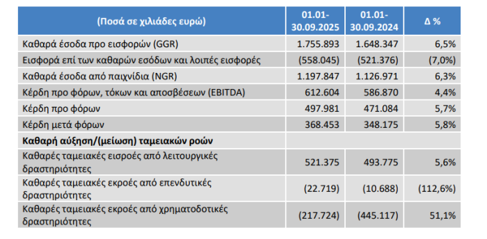 Ειδικότερα, ο ΟΠΑΠ κατέγραψε ισχυρή αύξηση στα βασικά οικονομικά μεγέθη του Ομίλου στο εννεάμηνο, καθώς τα καθαρά έσοδα προ εισφορών (GGR) ανήλθαν σε 1.755,9 εκατ. ευρώ, αυξημένα κατά 6,5% σε σχέση με το 2024 που ήταν στα 1.684,3 εκατ. ευρώ  ως αποτέλεσμα της ισχυρής ανάπτυξης στην επίγεια δραστηριότητα (retail) και στο online. Τα GGR του γ’ τριμήνου 2025 ανήλθαν σε €602,9εκ., υψηλότερα κατά 6,6% σε ετήσια βάση, κυρίως λόγω της δυναμικής επίδοσης των αριθμολαχείων.