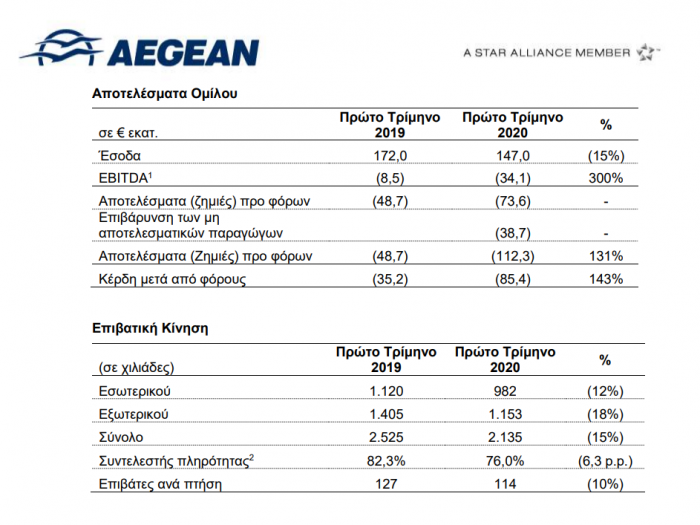 Αρνητικά, κάτι για ο οποίο είχε άλλωστε προειδοποιήσει, ήταν τα οικονομικά μεγέθη της Aegean στο α' τρίμηνο του 2020, με τις ζημίες της εταιρείας να διαμορφώνονται στα 85,4 εκατ. ευρώ από 35,2 εκατ. που ήταν στο αντίστοιχο διάστημα του 2019. Παράλληλα ο κύκλος εργασιών έφθασε στα 147 εκατα. ευρώ, παρουσιάζοντας πτώση της τάξης του 15%.
