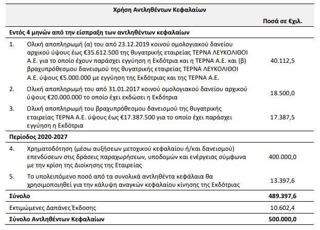 Εξάλλου, το Διοικητικό Συμβούλιο της ΓΕΚ ΤΕΡΝΑ ανακοίνωσε πώς θα αξιοποιηθούν τα κεφάλαια που αντλήθηκαν με τη νέα έκδοση ομολόγων. Το μεγαλύτερο μέρος (400 εκατ. ευρώ) θα αξιοποιηθεί για τη χρηματοδότηση επενδύσεων, ενώ θα αποπληρωθούν παλαιότερα δάνεια.
