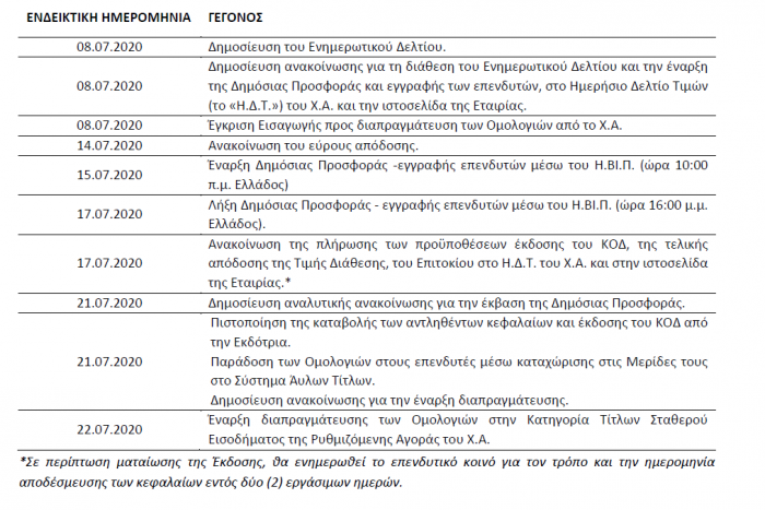 Η εταιρεία διευκρινίζει σε αυτό ότι η εγγραφή των επενδυτών μέσω του ηλεκτρονικού βιβλίου προσφορών θα ξεκινήσει στις 10:00 το πρωί της 15ης Ιουλίου και η δημόσια προσφορά θα λήξει στις 17 Ιουλίου στις 16:00. Την ίδια ημέρα θα ανακοινωθεί η πλήρωση των προϋποθέσεων της έκδοσης του ΚΟΔ, η τελική απόδοση της τιμής διάθεσης, και το επιτόκιο.