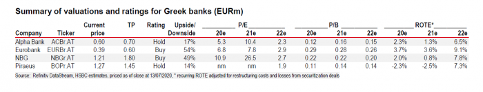 Σε ό,τι αφορά τις τιμές-στόχους, η HSBC δίνει 0,60 ευρώ για τη Eurobank, 1,80 ευρώ για την Εθνική, 0,70 ευρώ για την Alpha Bank και 1,45 ευρώ για την Πειραιώς. Έτσι, βλέπει περιθώρια ανόδου, σε σχέση με τις τρέχουσες τιμές τους στο ταμπλό, της τάξης του 17% για την Alpha, του 54% για την Eurobank, του 49% την Εθνική και του 14% για την Πειραιώς.